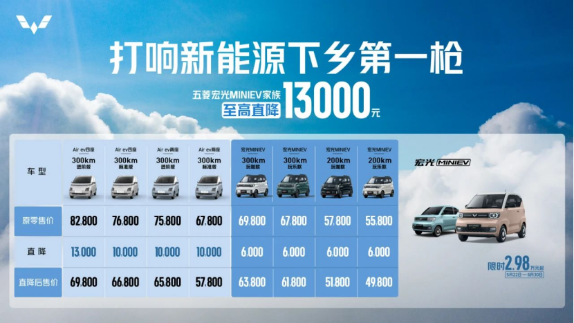 5月22日,五菱汽车官方消息显示,宏光MINI EV家族至高直降13000元,全系29800元起。> >