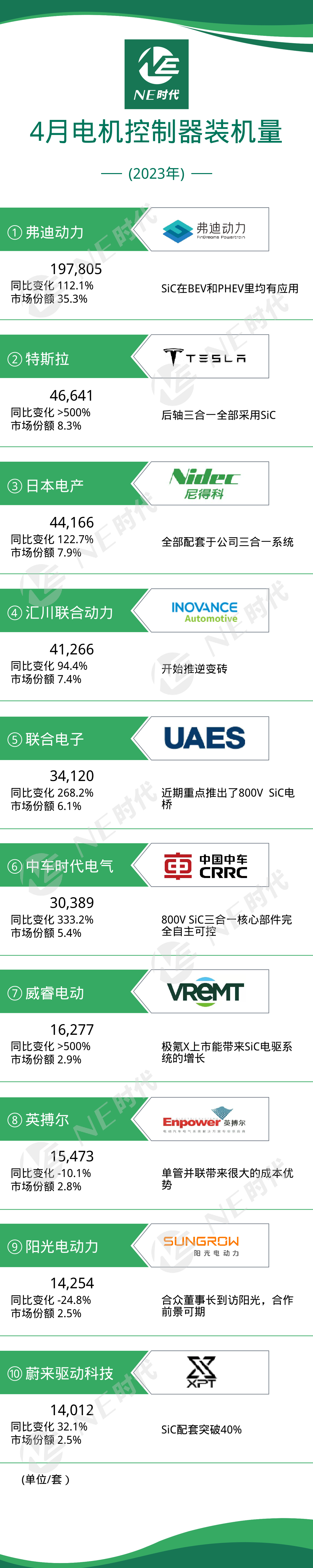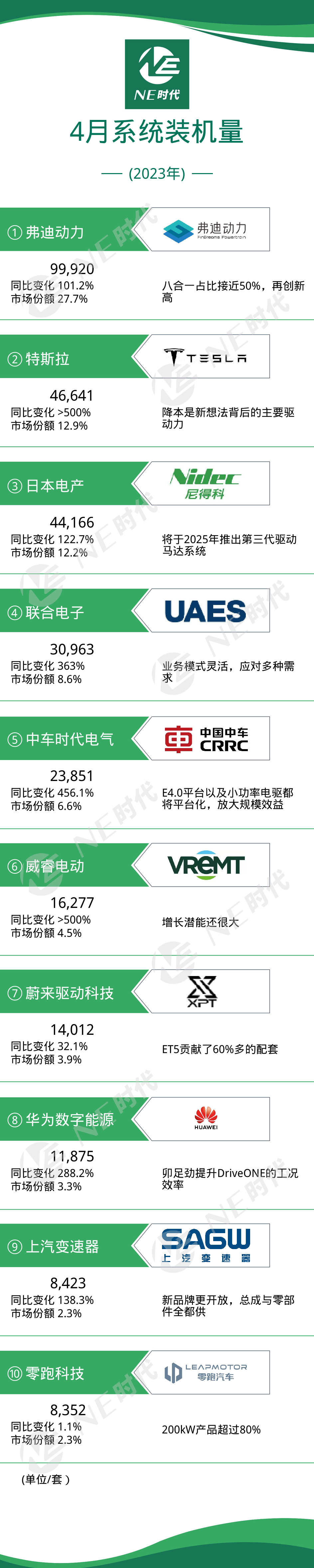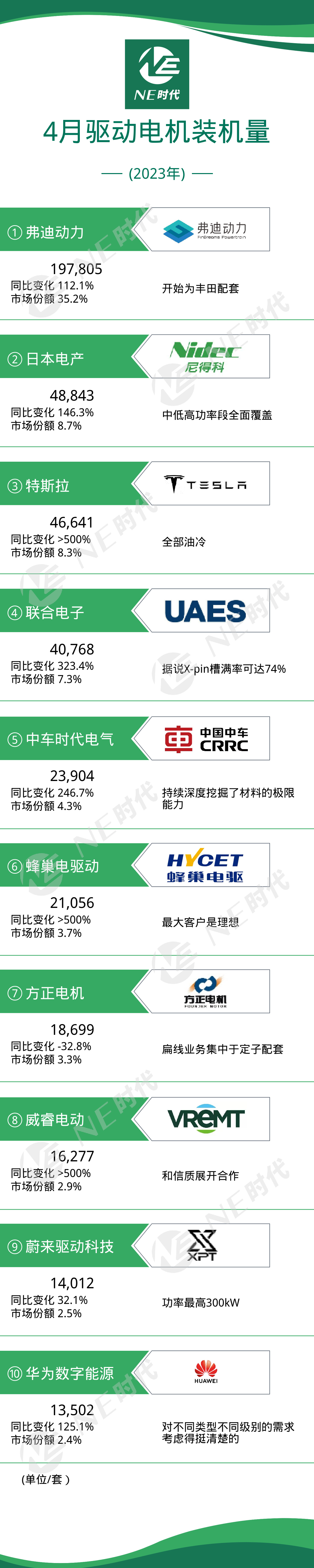 >NE时代根据新能源乘用车终端数据统计,2023年4月新能源乘用车电机累计搭载量为56.18万套,同比增长98.1%。新能源乘用车三合一及多合一电驱动系统搭载量为36.1万套,同比增长133.3%,占到总配套量的64.2%。> >