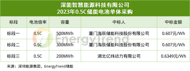 公告显示,海辰储能以单价0.607元/Wh中标标段一,海辰储能以单价0.607元/Wh中标标段二,亿纬动力以单价0.6349元/Wh中标标段三。 根据此前的招标公告显示, 深能智慧能源科技有限公司2023年0.5C储能电池单体采购项目电池总容量约1GWh,本项目招标共分三个标段,标段一预计容量为500MWh;标段二预计容量为300MWh;标段三预计容量为200MWh,计划于2023年6月至2024年3月分批投产。 本项目的招标范围为:深能智慧能源科技有限公司2023年0.5C储能电池单体采购,标的物为0.5C磷酸铁锂单体电池,单体容量280Ah,总容量约1GWh,包括但不限于:储能单体电池供货、安装指导、技术资料和技术服务、培训等,具体内容详见招标文件第八章技术规范书的有关规定并以其为准。 >