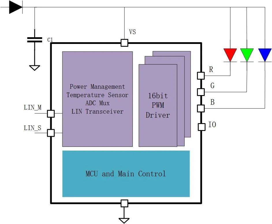 > > >>RGB色彩> >控制算法:> >泰矽微提供RGB色彩控制算法,包括基础RGB混光算法,动态温度补偿算法,光衰特性固定补偿算法,并支持第三方校准工具。可以实现丰富多彩的照明效果。汽车内部的氛围灯可以根据驾驶者的喜好和需求,自由切换和调整颜色、亮度和动态效果,为车内营造出独特而舒适的氛围。> >