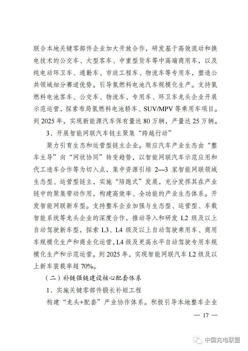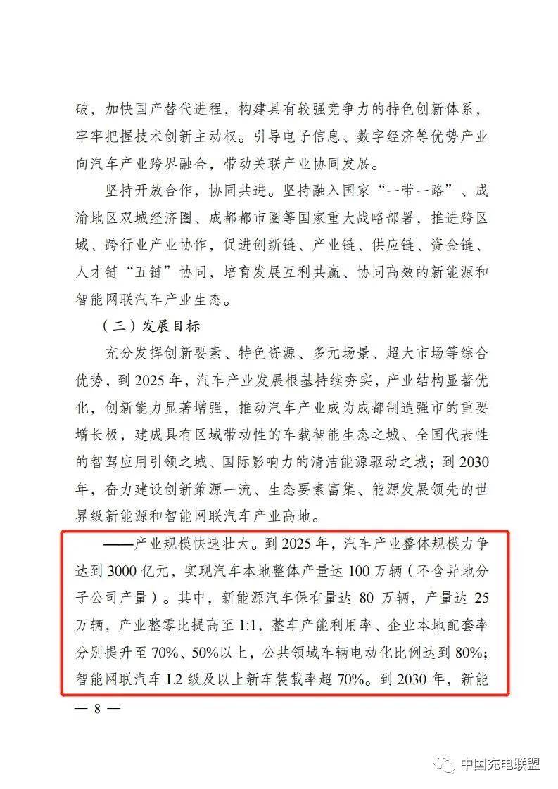 >《规划》明确>产业规模快速壮大。>到 2025 年,汽车产业整体规模力争达到 3000 亿元,实现汽车本地整体产量达 100 万辆(不含异地分子公司产量)。其中,新能源汽车保有量达 80 万辆,产量达 25万辆,产业整零比提高至 1:1,整车产能利用率、企业本地配套率分别提升至 70%、50%以上,公共领域车辆电动化比例达到 80%;智能网联汽车 L2 级及以上新车装载率超 70%。到 2030 年,新能>源和智能网联汽车产业链供应链创新链具备较强国际辐射能力。>