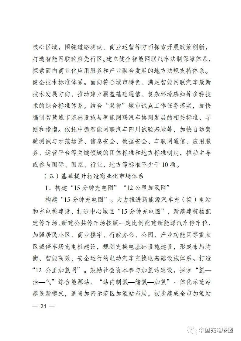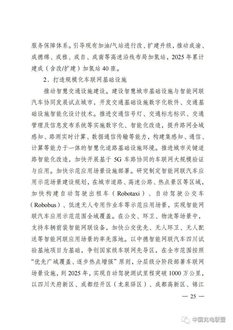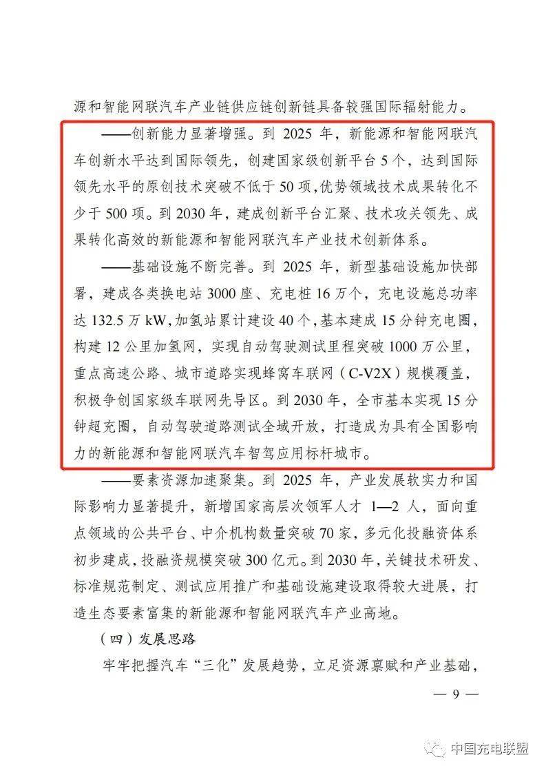 >《规划》明确>基础设施不断完善。>到 2025 年,新型基础设施加快部>署,建成各类换电站 3000 座、充电桩 16 万个,充电设施总功率达 132.5 万 kW,加氢站累计建设 40 个,基本建成 15 分钟充电圈,构建 12 公里加氢网,实现自动驾驶测试里程突破 1000 万公里,重点高速公路、城市道路实现蜂窝车联网(C-V2X)规模覆盖,积极争创国家级车联网先导区。到 2030 年,全市基本实现 15 分钟超充圈,自动驾驶道路测试全域开放,打造成为具有全国影响力的新能源和智能网联汽车智驾应用标杆城市。>