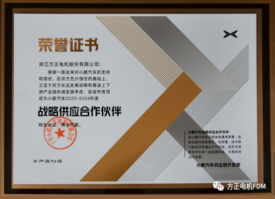 >小鹏汽车供应链总监和浙江方正电机股份有限公司董事长等双方领导出席本次签约和授牌仪式。 >