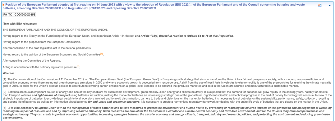 > >2023年6月14日,欧洲议会以587票赞成,9票反对和20票弃权,通过了一项针对电池产品可持续性等指标作出更严格要求的新规定,也就是在国内常被称为的《欧洲电池法》。接下来,欧盟理事会将正式进行程序性地批准和发布,这项法规预计在2023年第三或第四季度生效。>