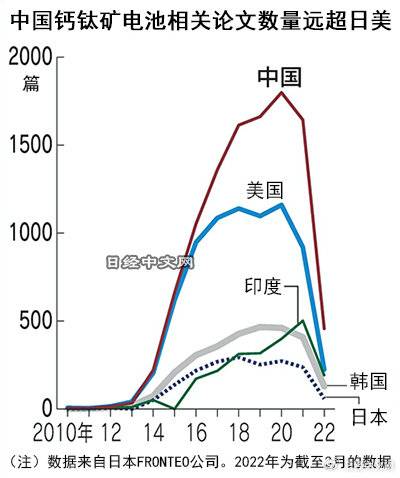 从事数据解析服务的日本FRONTEO公司调查了从2010年到2022年3月发表的超过3.8万篇钙钛矿型相关国际论文。结果发现,尽管这是日本开发出的新兴技术领域,在基础研究上领先的也是中国。