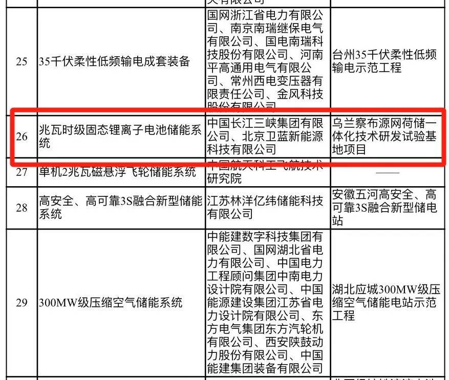 > >10月24日,国家能源局2023年第6号公告公布第三批能源领域首台(套)重大技术装备(项目)名单,此次共计有58个技术装备(项目)入选,其中储能领域项目8个,由卫蓝新能源与中国长江三峡集团共同研制的“兆瓦时级固态锂离子电池储能系统”榜上有名。 >