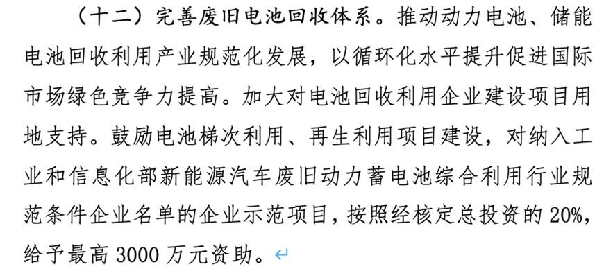 > >2023年11月2日,深圳市发展和改革委员会发布关于公开征求《深圳市促进安全节能环保产业集群高质量发展的若干措施(征求意见稿)》意见的通告,通告中指出为推动动力电池、储能电池回收利用产业化规范化发展,将加大对电池回收利用企业建设项目用地支持。鼓励电池梯次利用、再生利用项目建设,对纳入工业和信息化部新能源汽车废旧动力蓄电池综合利用行业规范条件企业名单的企业示范项目,按照经核定总投资的20%,给予最高3000万元资助。> >