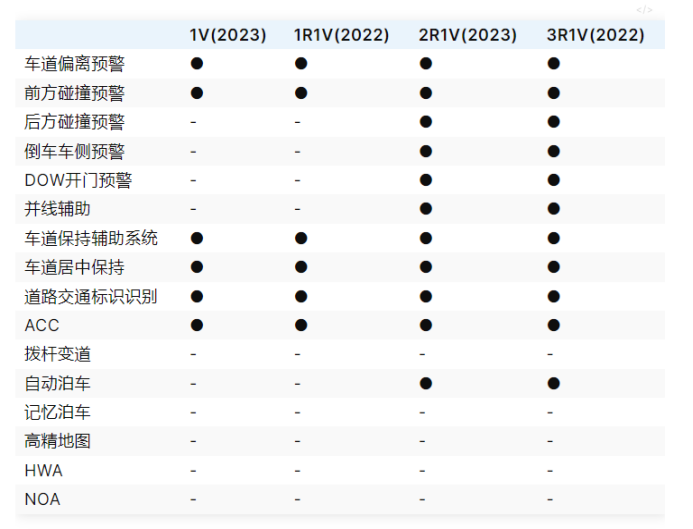 对比发现1V和1R1V、2R1V和3R1V在功能安全上没有差别,可以认为比亚迪技术升级,从硬件上进行降本,1V和2R1V会分别替代1R1V和3R1V。>