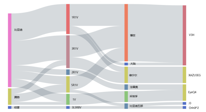 >-1V和2R1V的芯片均使用EyeQ4、3R1V使用V3H,1R1V使用V3H和XAZU3EG,>根据上述分析的1V和2R1V会分别替代1R1V和3R1V,EyeQ4的份额比例将会逐渐增大,V3H和XAZU3EG的份额比例将会逐渐减小。同理博世、维宁尔、大陆的份额将进一步压缩,法雷奥和采埃孚份额增大。> >