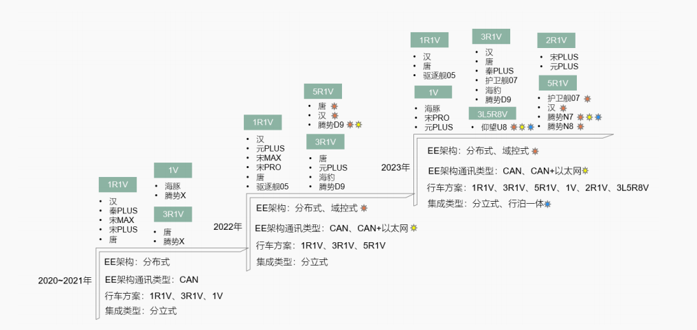 >2022年,比亚迪的EE架构开始出现域控式,且通讯方式为CAN֢以太网;2023年开始,集成方式出现行泊一体。> >