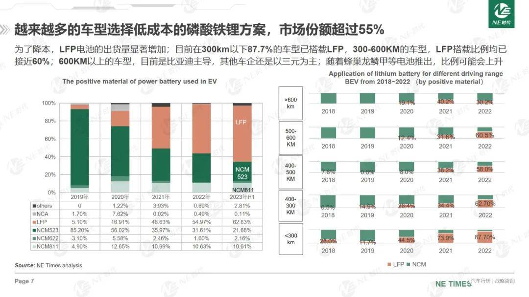 应用层面,中国乘用车市场LFP电池的出货量显著增加。目前在300km以下87.7%的车型已搭载LFP,300-600KM的车型搭载比例接近60%;600KM以上车型,比亚迪大规模切换LFP电池。未来,随着蜂巢龙鳞甲等电池推出,LFP搭载比例可能会上升。