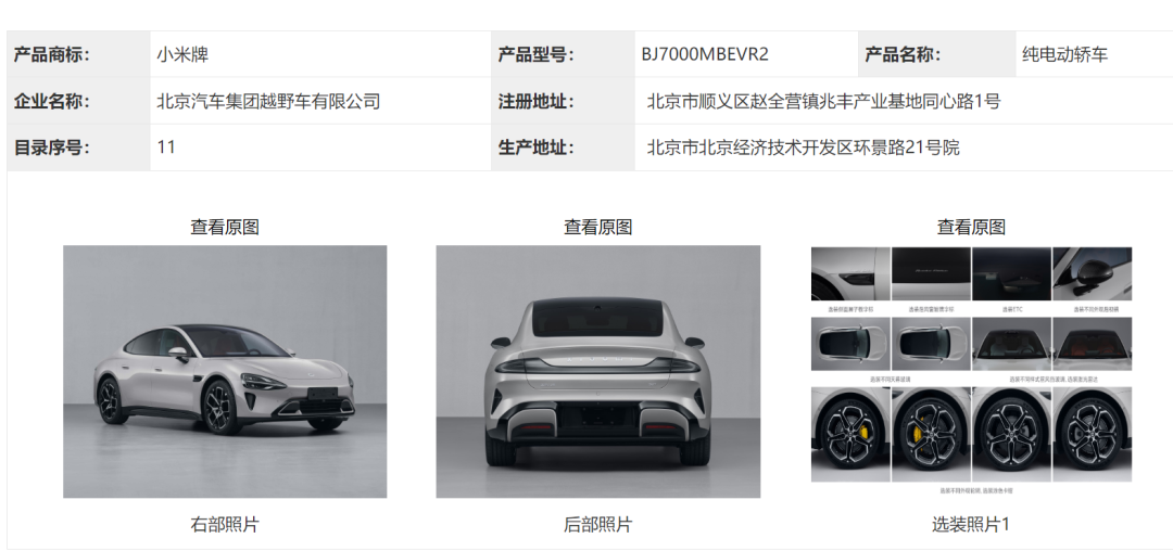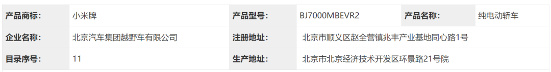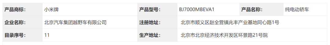 >11月15日,小米汽车登陆工信部新一批新车申报目录,申报两款新车,由北京汽车集团越野车有限公司代工,产品车尾采用了北京小米的字样,生产地址北京市北京经济技术开发区环景路21号院。>