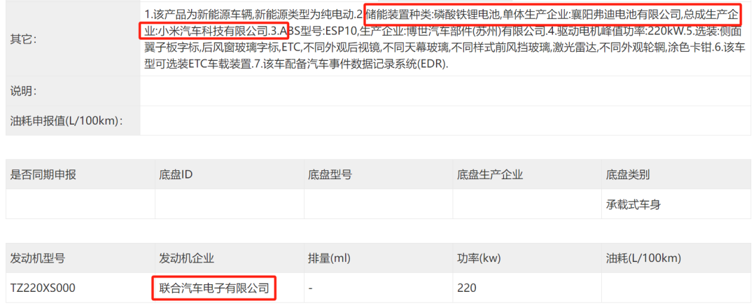 >在377批新车公告中,小米还申报了一款纯电动轿车(产品型号:BJ7000MBEVR2)北京小米SU7,整车尺寸4997*1963*1455mm,轴距3000mm。搭载磷酸铁锂电池,单体由襄阳弗迪动力供应,PACK为小米汽车科技有限公司自制,电机供应商为联合汽车电子。> >