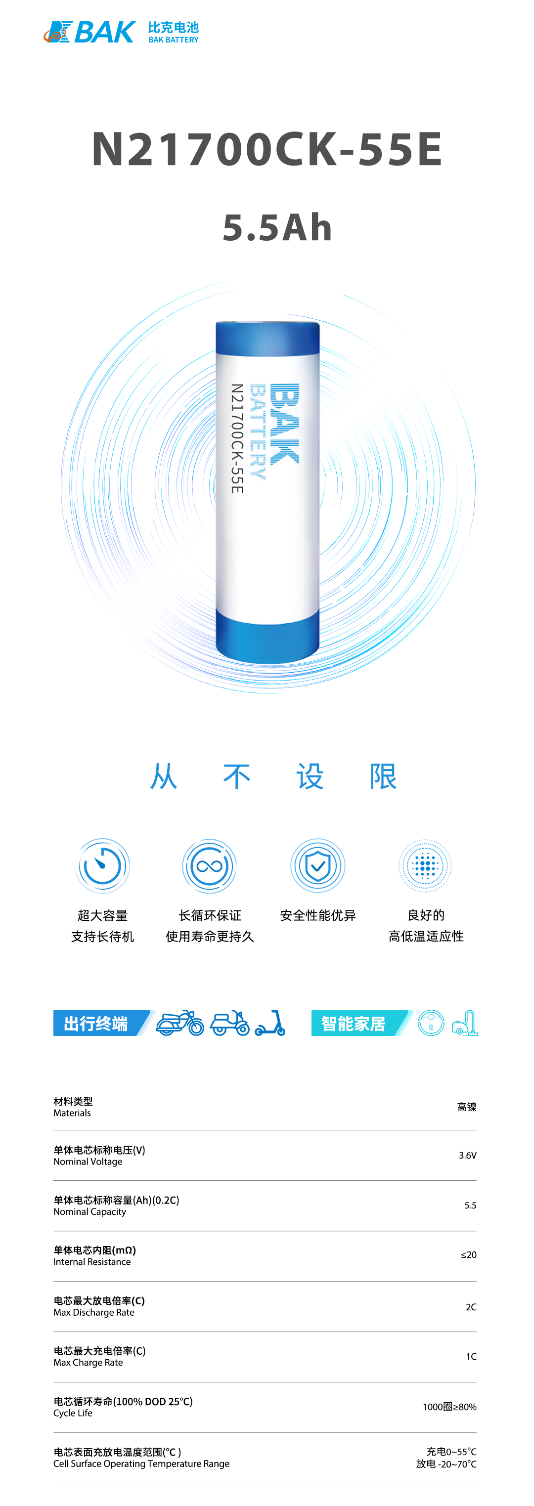 > > > > >比克电池21700-5.5Ah电芯采用高镍+硅负极体系,Ni(镍)含量高达90%,负极材料使用高首效硅,达成了正负极效率的匹配,性价比再次得以提升,可实现-20℃~+70℃的宽温度范围放电,满足极端环境下正常使用需求的同时,经过了过充电、过放电、短路、跌落、加热、震动、挤压等严苛的性能测试,具备高安全可靠性,加之满充放常规循环1000周、快充循环600周的长寿命,适用于高容量需求的多应用场景,将为市场应用和终端体验再次加码。>