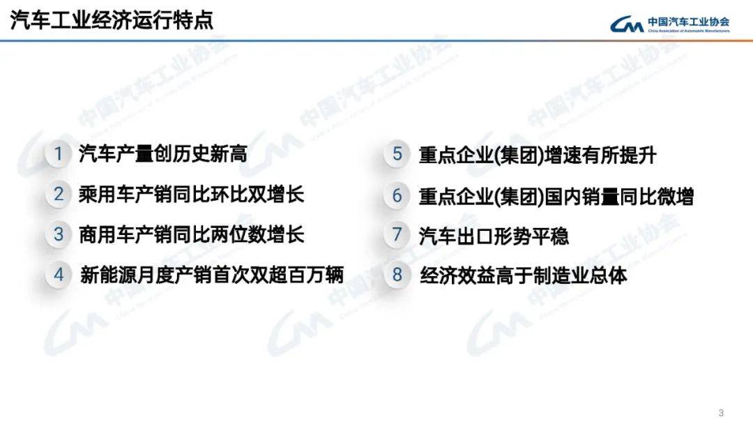 > >据中国汽车工业协会分析,8月,我国宏观经济景气水平总体继续保持扩张,当月汽车产销同比保持10%以上增长,其中新能源汽车和汽车出口继续呈现良好态势,传统燃料汽车市场企稳。“两新”政策持续发力,个人消费贷款财政贴息等政策及时出台,企业新车型投放热情较高,行业综合整治“内卷”工作继续显效,汽车总体运行平稳...