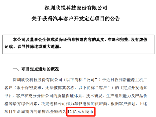 >>12月13日,深圳欣锐科技股份有限公司于近日收到新能源主机厂客户(限于保密要求,无法披露其名称,以下简称“客户”)的《定点开发通知书》,客户在充分分析公司的质量保证体系、技术研发、生产组织能力及产品价格等诸方综合因素,决定选择公司作为车载电源的供应商。根据客户规划,该项目生命周期内的销售总金额约为 12 亿元人民币。> > >
