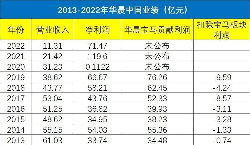 >这么多年的时间里,华晨中国不拉后腿只有三年,除了2007年、2010年、2011年三年处于盈利状态之外,绝大多数主营业务均为亏损状态,且亏损额在2012年之后彻底疯涨,企业的运转,全靠宝马输血。>