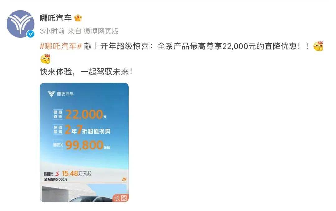 >该公司于2月19日对外宣布,其多款主力车型将启动全系降价;其中,哪吒X全系降价22000元,哪吒AYA全系降价8000元,哪吒S全系降价5000元。> >