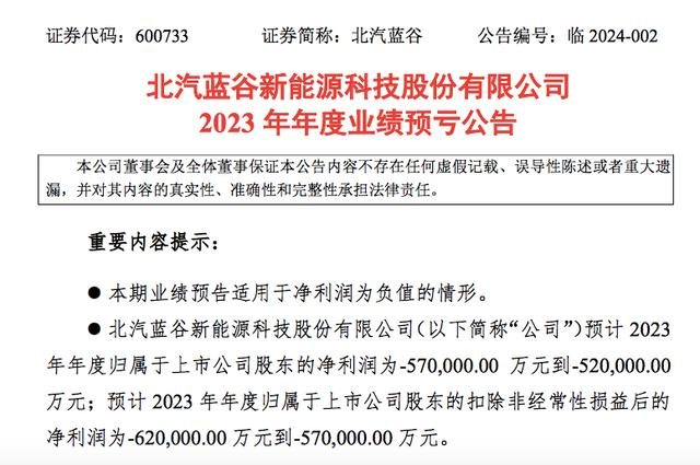 >北汽蓝谷连续多年亏损。2024年1月15日晚间,北汽蓝谷发布2023年度业绩预亏公告,预计2023年度归属于上市公司股东>净利润为亏损52亿元-57亿元,预计扣除非经常性损益后的净利润为亏损57亿元-62亿元。> >