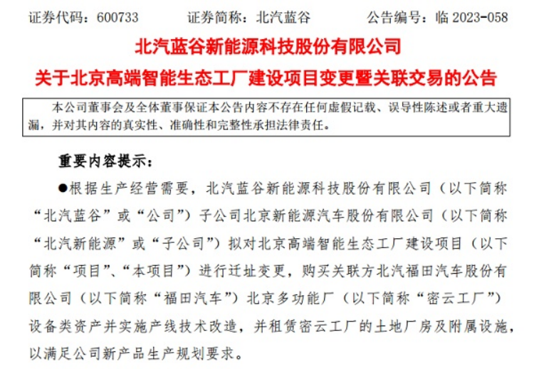 >2023年8月,才重启工厂建设项目,并迁址。>北汽蓝谷(600733.SH)当时发布公告称,根据生产经营需要,北汽蓝谷子公司北汽新能源拟对北京高端智能生态工厂建设项目(以下简称“智能工厂项目”)>投资项目进行迁址变更,购买关联方北汽福田汽车股份有限公司北京多功能厂(以下简称“密云工厂”)设备类资产并实施产线技术改造,同时拟租赁密云工厂的土地厂房及附属设施,以满足公司新产品生产规划要求。>