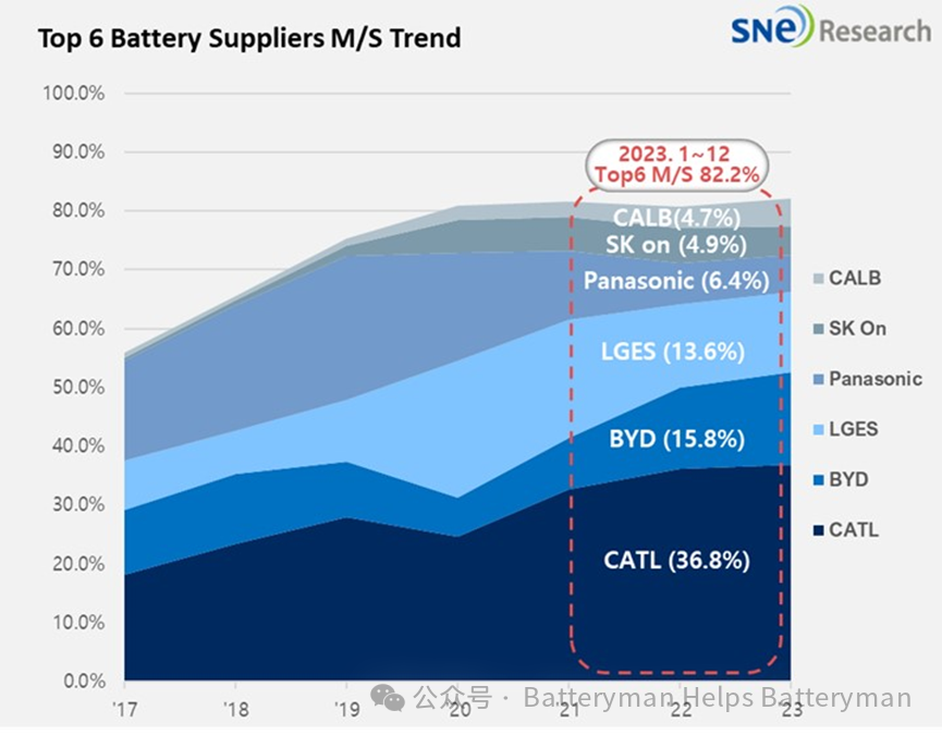 2023 >年,>CATL>的电池装机容量将达到>259.7GWh>,比> 2022 >年的>184.4GWh>增长> 40.8%>。这家中国动力电池巨头以>36.8%>的份额继续蝉联全球第一,并且仍然是全球唯一一家市场份额超过>30%>的电池供应商。>CATL>已为>ZEEKR 001 >和> GAC AION Y >等大多数畅销车型以及> Model 3/Y>、>BMW iX >和>Mercedes EQS >等全球主要原始设备制造商提供电池。>比亚迪>2023>年动力电池装机量为> 111.4 GWh>,比>2022>年的>70.5 GWh>增长> 57.9%>。>2023>年,该公司以>15.8%>的份额位居第二,高于>2022>年的>13.9%>,也高于>1-11 >月份的>15.7%>。比亚迪通过内部电池供应和汽车制造等纵向供应链管理整合,以价格竞争力著称。最近,比亚迪主要通过> Atto 3>(元>plus>)车型和海豚快速扩大在中国以外地区的市场份额。>韩国>LG>新能源>2023>年动力电池装机量为>95.8>吉瓦时,同比增长>33.8%>。该韩国公司以> 13.6% >的份额位居全球第三,低于去年同期的>14.1%>,与> 1-11 >月持平。这得益于特斯拉> Model 3/Y>、大众> ID. >系列和福特野马> Mach-E >在欧洲和北美的广受欢迎。虽然特斯拉、福特、通用汽车等整车厂都在扩大>LFP>电池的安装比例,但由于市场需求低迷,不确定因素仍然较多,>LGES >决心通过加速开发高电压、>Mid-Ni NCM >和> LFP >电池以及量产> 46xx >系列电池来提高竞争优势。此外,随着通用> Blazer EV >等应用> Ultium >平台的新车型的推出,一些不确定因素有望随着> Ultium Cells >电池使用量的增加而消除。>日本松下公司>以>6.4%>的份额位居第四,榜单前十名中唯一的日本公司松下是特斯拉的主要电池供应商之一,在北美市场,松下的大部分电池都安装在特斯拉> Model Y >上。据悉,松下即将推出先进的> 2170 >电池和> 4680 >电池,预计未来松下的市场份额将主要集中在特斯拉。>韩国>SK On>公司>以>4.9%>的份额位居第五,由于现代>IONIQ 5>和起亚>EV6>在全球的热销、起亚>EV9>在全球销量的扩大以及福特>F-150 Lightning>在北美的稳定销售,>SK On>实现了增长。最近,据报道,>SK On >在开发市场热捧的棱柱电池和> LFP >电池方面已取得了相当的成就,预计将主要在北美地区扩大市场份额。中国>CALB>公司>以>4.7%>的份额位居第六。>韩国三星> SDI>、中国国轩高科、亿纬锂能和欣旺达>分别以>4.6%>、>2.4%>、>2.3%>和>1.5%>的份额位居第七、第八、第九和第十位。值得注意的是,在> SNE Research 1-11 >月份的排名中,中国的>Farasis Energy>首次上榜,取代了排名第>10 >位的欣旺达。在最新的>2023 >年全年排名中,欣旺达取代> Farasis >再次上榜。> >