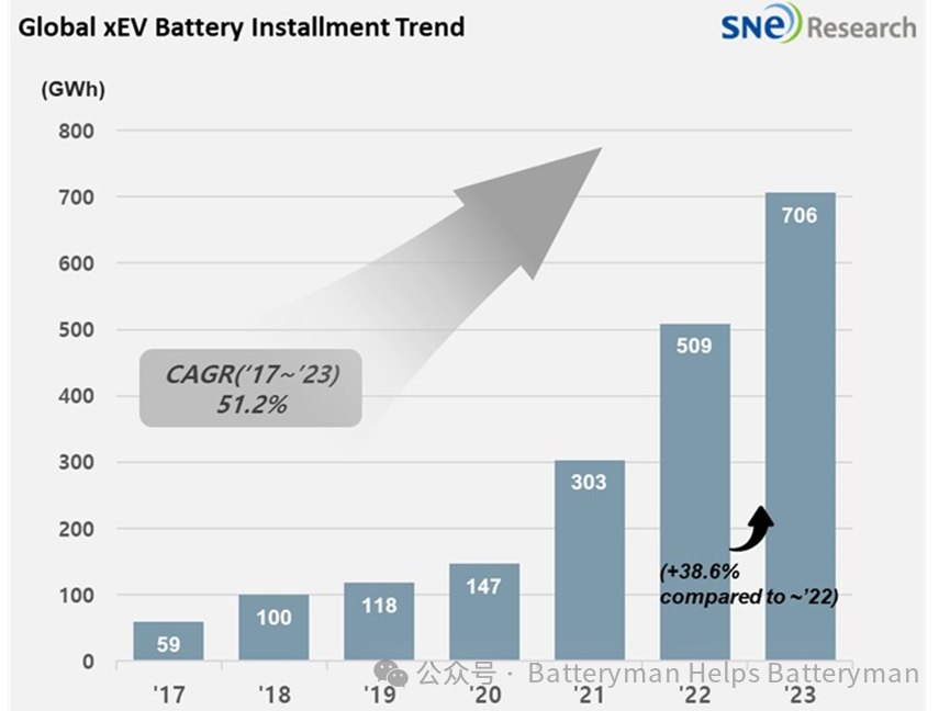 从> 2023 >年> 1 >月到> 12 >月,全球登记的电动汽车(>EV>、>PHEV>、>HEV>)电池的装机量约为> 705.5GWh>,同比增长> 38.6%>。> >