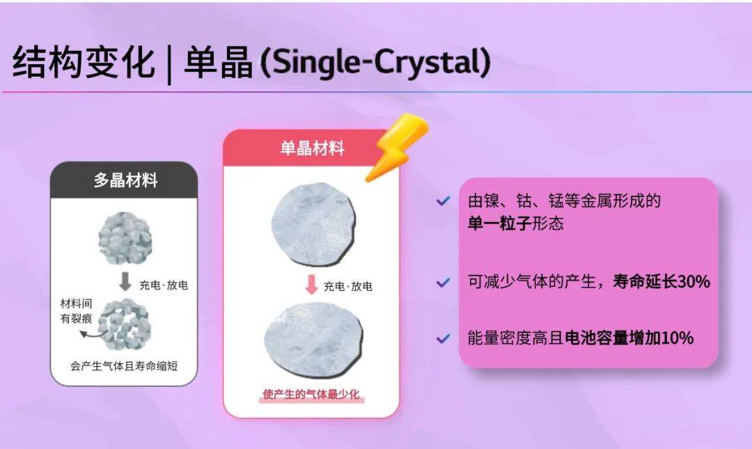 >>现有的多晶正极材料是将金属离子聚集形成的多粒子结构。随着充电和放电次数的增加,材料之间的空隙就越大,容易产生气体。因此,电池寿命就会逐渐缩短,也会发生电池膨胀现象。> >