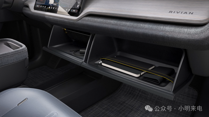 >至于里维安R2的内部,有一些有趣的功能。例如,你会得到两个手套箱,而不是一个;>