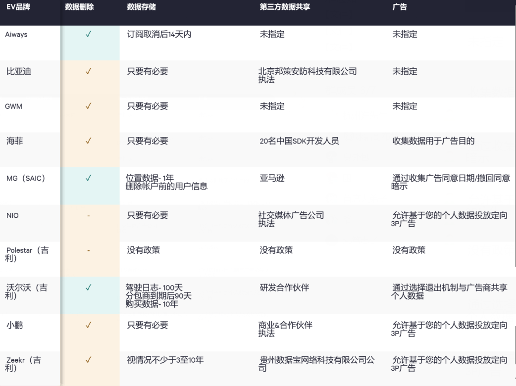 >沃尔沃、Aiways和MG在数据存储和删除方面的政策对消费者最为友好。比亚迪、GWM、蔚来、小鹏和HiPhi都有开放式的存储方法,而Polestar没有提供政策。> >