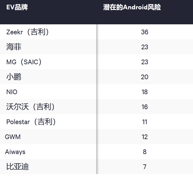>>Zeekr应用程序以及Nio,GWM和Xpeng,要求READ_MEDIA_AUDIO,READ_MEDIA_ICODE,READ_MEDIA_VIDEO权限,允许应用程序读取用户的所有媒体文件。MG和Volvo应用程序都要求DOWNLOAD_WITHOUT_NOTIFICATION权限,允许静默下载,这会带来恶意软件下载的潜在安全风险。HiPhi应用程序请求DISABLE_KEYGUARD权限,这允许它绕过设备的锁屏并暴露敏感信息。Xpeng、Nio、Volvo、Polestar、GWM、Aiways和BYD这六个应用程序请求RECEIVE_BOOT_COMPLETED权限。此权限允许在设备完成启动过程后向应用发出警报。这会带来潜在的隐私风险,因为应用程序可以在设备启动后自行启动或安排任务运行。自动启动的应用可以在设备启动后立即开始收集数据或监控用户行为,即使用户尚未主动启动应用。GWM应用程序请求RECEIVE_USER_PRESENT权限,该权限允许在用户主动使用设备时向应用程序发出警报。这可用于推断用户行为或模式,这对用户隐私构成风险。> >