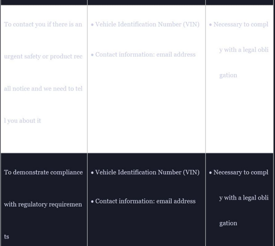 > >>下表列出了每个汽车制造商收集的个人数据点。这些数据收集分为个人信息、车辆信息、车辆状态和设备信息。点击表格右上角的按钮,将其展开为全屏视图,以查看所有公司的数据收集。> >