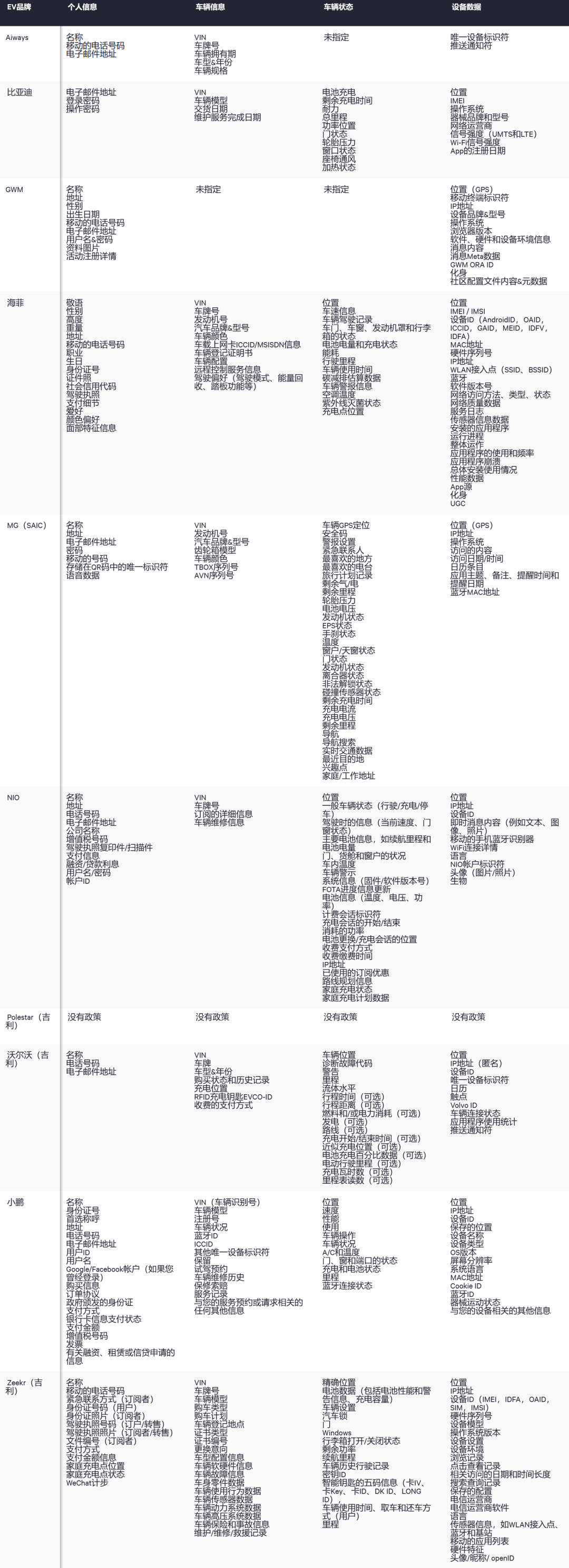 >* Aiways和GWM并不声称收集了与竞争对手一样多的数据,但他们在这方面的政策存在重大差距。> >