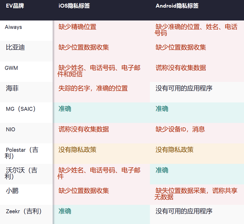 >>令人担忧的是,小鹏、Aiways、比亚迪和HiPh的应用商店列表都带有隐私标签,但却忽略了他们收集的位置数据。> >