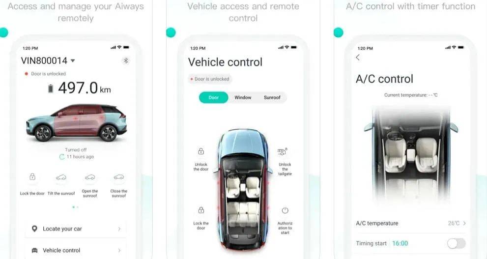 >Aiways iOS移动的应用程序屏幕截图显示远程车辆控制选项> >