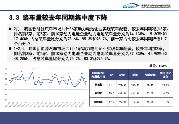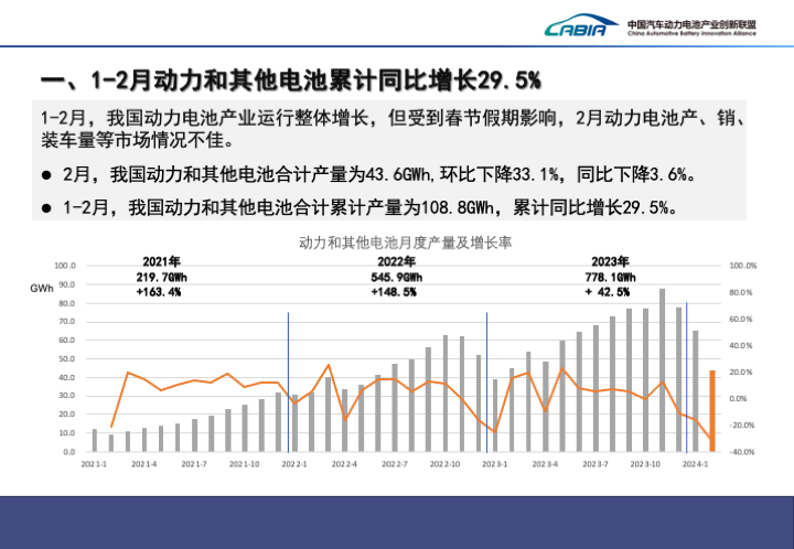 > 1-2月,我国动力电池产业运行整体增长,但受到春节假期影响,2月动力电池产、销、装车量等市场情况不佳。> 2月,我国动力和其他电池合计产量为43.6GWh,环比下降33.1%,同比下降3.6%。> 1-2月,我国动力和其他电池合计累计产量为108.8GWh,累计同比增长29.5%>