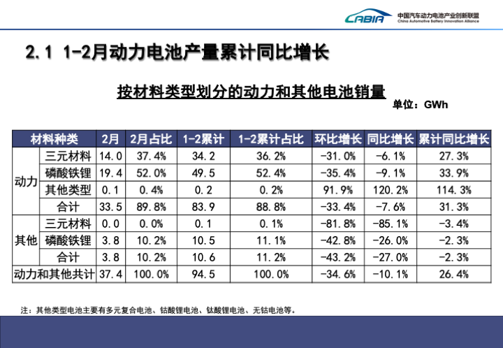 >1-2月,我国动力电池累计装车量50.3GWh, 累计同比增长32.0%。其中三元电池累计装车量19.5Wh,占总装车量38.9%,累计同比增长60.8%;磷酸铁锂电池累计装车量30.7GWh,占总装车量61.1%,累计同比增长18.6%>。>