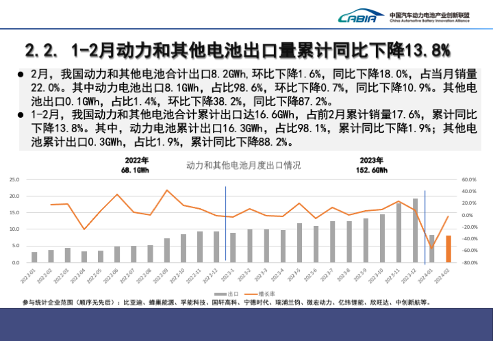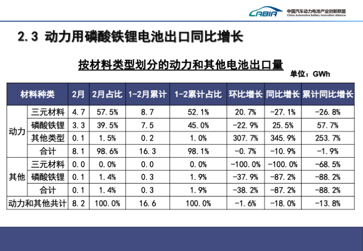 > 2月,我国动力和其他电池合计销量为37.4GWh,环比下降34.6%,同比下降10.1%。其中,动力电池销量为33.5GWh,占比89.8%,环比下降33.4%,同比下降7.6%;其他电池销量为3.8GWh,占比10.2%,环比下降43.2%,同比下降27.0%。> 1-2月,我国动力和其他电池合计累计销量为94.5GWh,累计同比增长26.4%。其中,动力电池累计销量为83.9GWh,占比88.8%,累计同比增长31.3%;其他电池累计销量为10.6GWh,占比11.2%,累计同比下降2.3%>。> 2月,我国动力和其他电池合计出口8.2GWh,环比下降1.6%,同比下降18.0%,占当月销量22.0%。其中动力电池出口8.1GWh,占比98.6%,环比下降0.7%,同比下降10.9%。其他电池出口0.1GWh,占比1.4%,环比下降38.2%,同比下降87.2%。> 1-2月,我国动力和其他电池合计累计出口达16.6GWh,占前2月累计销量17.6%,累计同比下降13.8%。其中,动力电池累计出口16.3GWh,占比98.1%,累计同比下降1.9%;其他电池累计出口0.3GWh,占比1.9%,累计同比下降88.2%。>