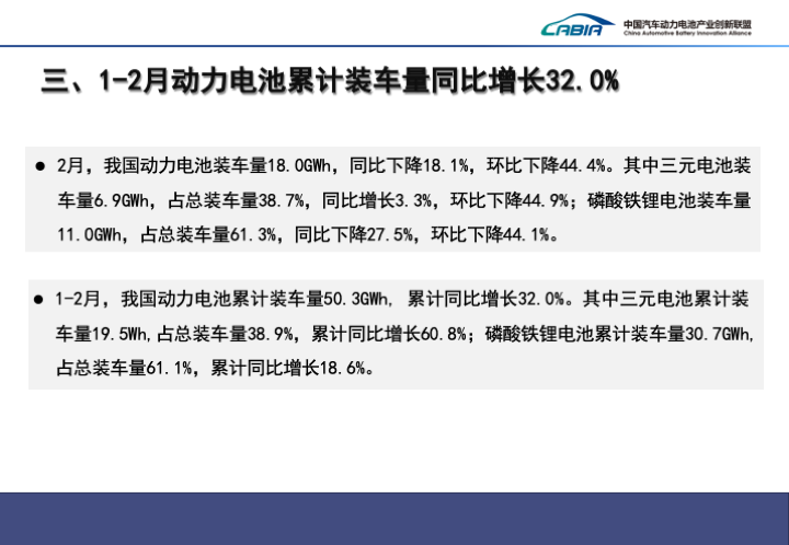 >2月,我国动力电池装车量18.0GWh,同比下降18.1%,环比下降44.4%。其中三元电池装车量6.9GWh,占总装车量38.7%,同比增长3.3%,环比下降44.9%;磷酸铁锂电池装车量11.0GWh,占总装车量61.3%,同比下降27.5%,环比下降44.1%>。>