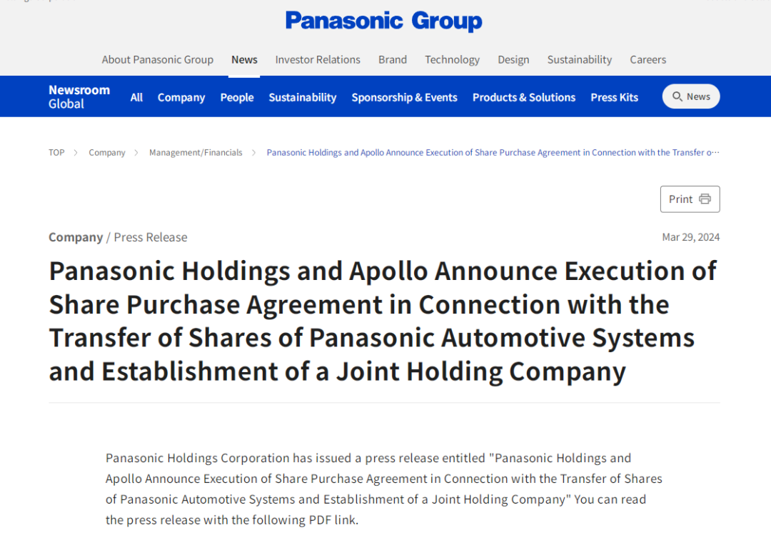 近日,围绕松下汽车系统,松下集团与美国私募股权公司阿波罗正式签署了股权转让协议。阿波罗旗下基金将收购松下汽车系统的多数股权,预计收购估值为3110亿日元(约合人民币148亿元),交易将在2025年3月底之前完成。今后松下汽车系统将由松下和阿波罗共同运营。>