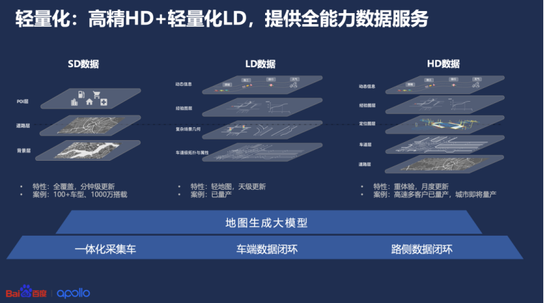 >相对于高精地图,百度的LD地图的制作成本大幅下降。>百度地图的LD图采用视觉感知大模型生成的>,>大量减少了人工标注。>用>百度副总裁>尚国斌的话说,>它不是生产的地图,它是生成的地图。>