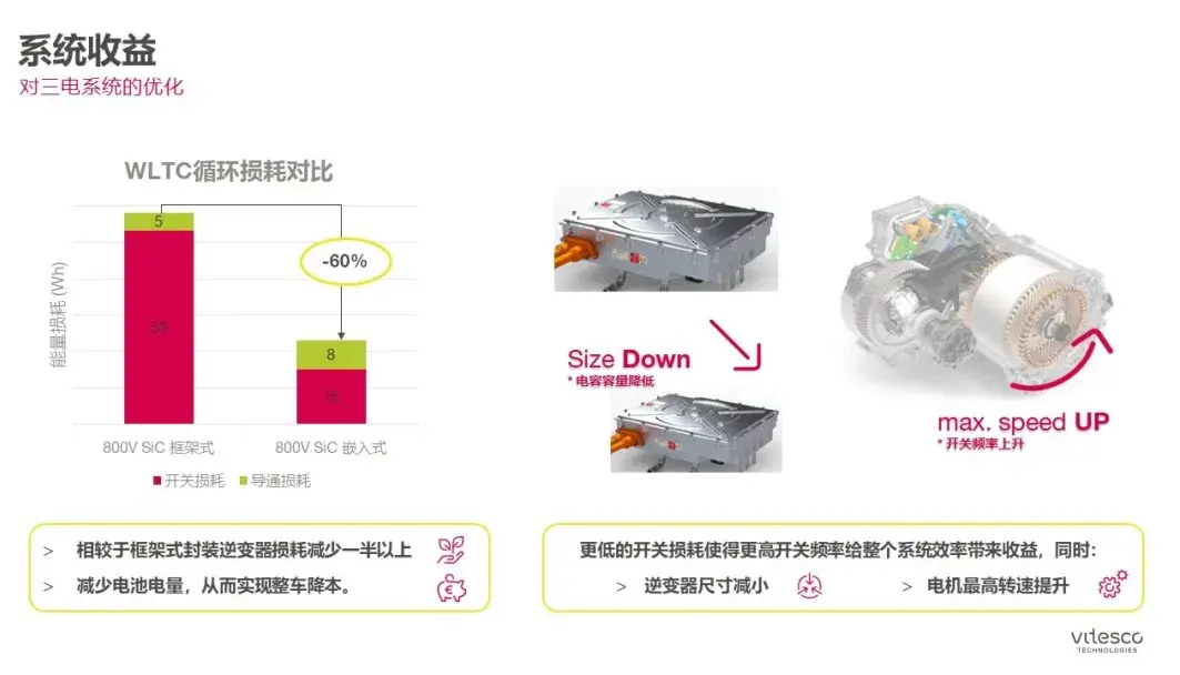 >整车上可以通过提高开关频率来提升电驱系统整体的效率,从而基于同样的续航里程减少了电池的用量,最终达到整车降本的目的。同时更高的开关频率使得更小的逆变器体积,以及同样极对数下控制更高速的电机成为可能。>