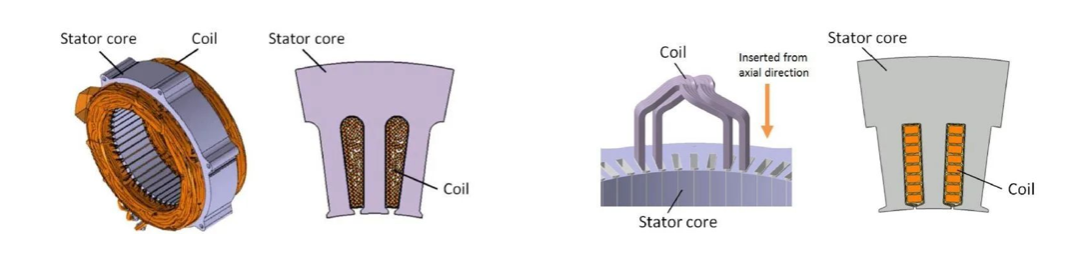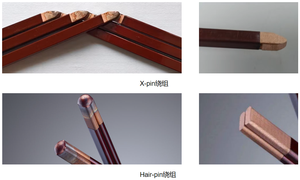 X-pin是斜弧面段线,Hair-pin是长方形线,而且X-pin的焊接端紧密平齐比Hair-pin低了近十多毫米,使得其功率密度更高,相比I-pin和Hair-pin电机,可以在相同体积下输出更大的功率,所以电机绕组结构的不同也可以优化电机大小。