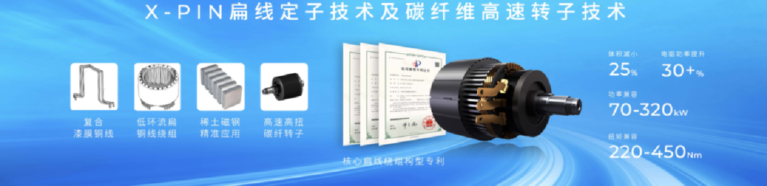 而埃安研发的 X-pin 扁线定子技术在 缩小电机 25% 体积 的前提下,还可将其 功率提升30% 以上 ,还可实现多平台兼容,并在70kW-320kW 功率范围、220-450Nm 扭矩范围覆盖。