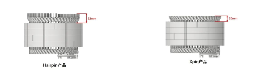 X-pin绕组也可改善I-pin绕组端部过高的技术痛点,相比I-pin绕组可缩短43%(这里每家技术不一样具体减小的尺寸笔者只选取了市面上已有技术的大概),也无需焊接前的切平工艺。