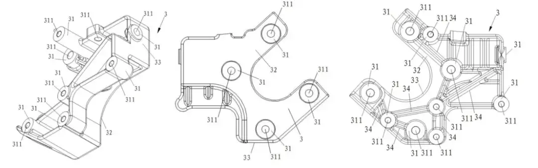 这款特殊的连接架是由:>连接板32、连接框33、连接柱34>和>筋板35>组成,其中连接柱被多面设置,可与电机端盖、减速器壳体和控制器壳体连接,通过调整连接柱长度,实现与各部件的有效接触和连接,增强了整体结构的刚度。>