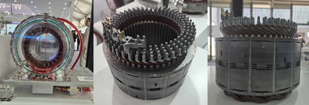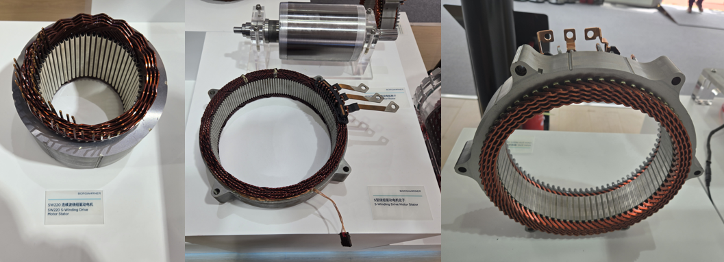 >电机部分这次展出的也不少,有>SW220连续波绕扁线电机、S型绕组扁线电机>、S型绕组与1-pin或发夹式绕组相比,导线端匝高度较短,焊接点也比发夹式定子减少了90%以上,而且还更容易增加插槽数和层数,且不会使成本大幅飙升。>