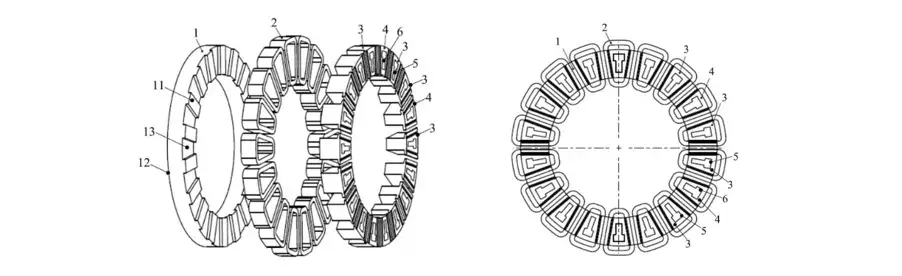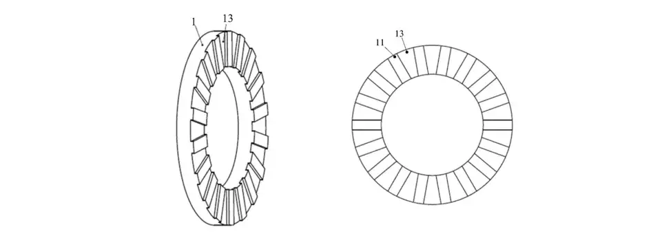 >此外,在极靴上还设置了>沿径向延伸的气隙槽>,用以抵消>有害谐波分量>,>降低磁场谐波并改善转矩脉动性能>。根据制造需求,定子轭与芯体可以选择>分体成型>或>一体成型>,前者>降低制造精度要求和成本>,后者> >简化装配工艺> >。> >