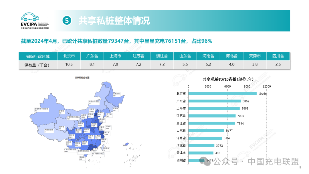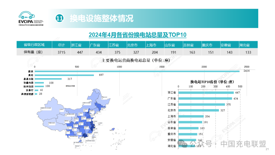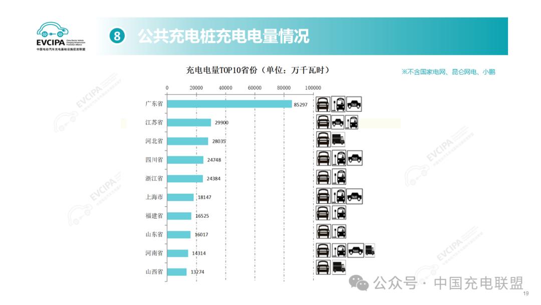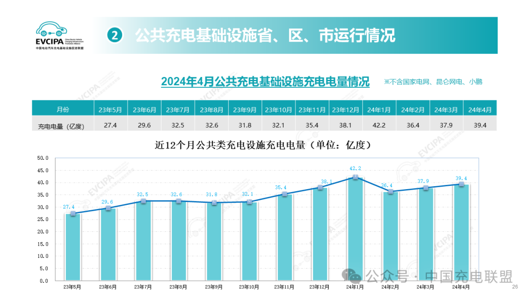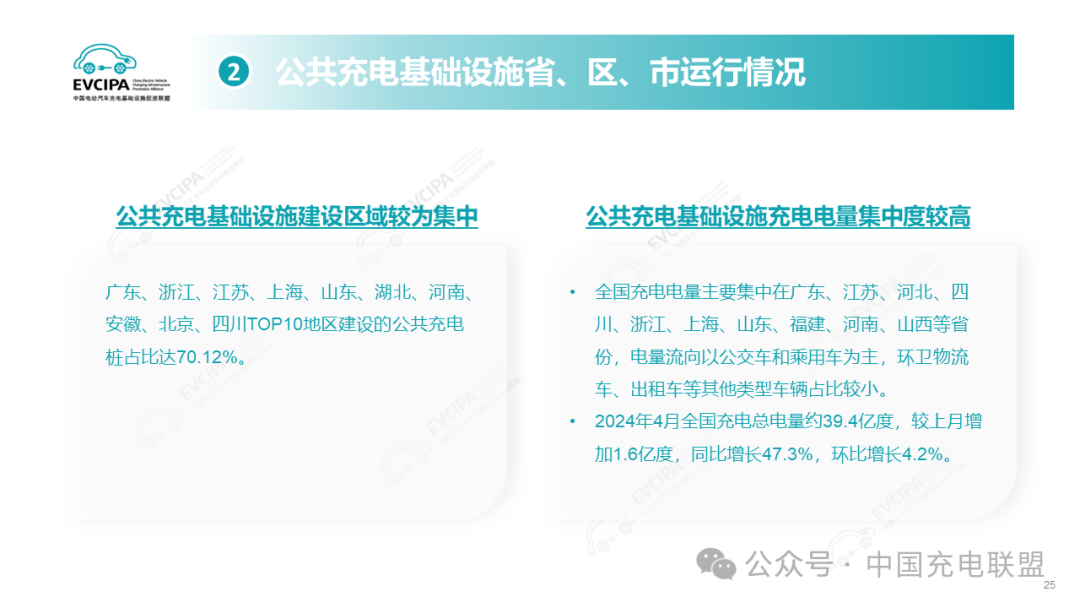 公共充电基础设施省、区、市运行情况,广东、浙江、江苏、上海、山东、湖北、河南、安徽、北京、四川TOP10地区建设的公共充电桩占比达70.12%。全国充电电量主要集中在广东、江苏、河北、四川、浙江、上海、山东、福建、河南、山西等省份,电量流向以公交车和乘用车为主,环卫物流车、出租车等其他类型车辆占比较小。2024年4月全国充电总电量约39.4亿度,较上月增加1.6亿度,同比增长47.3%,环比增长4.2%。