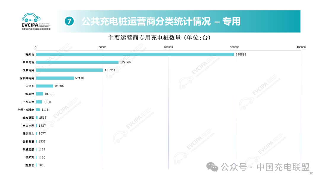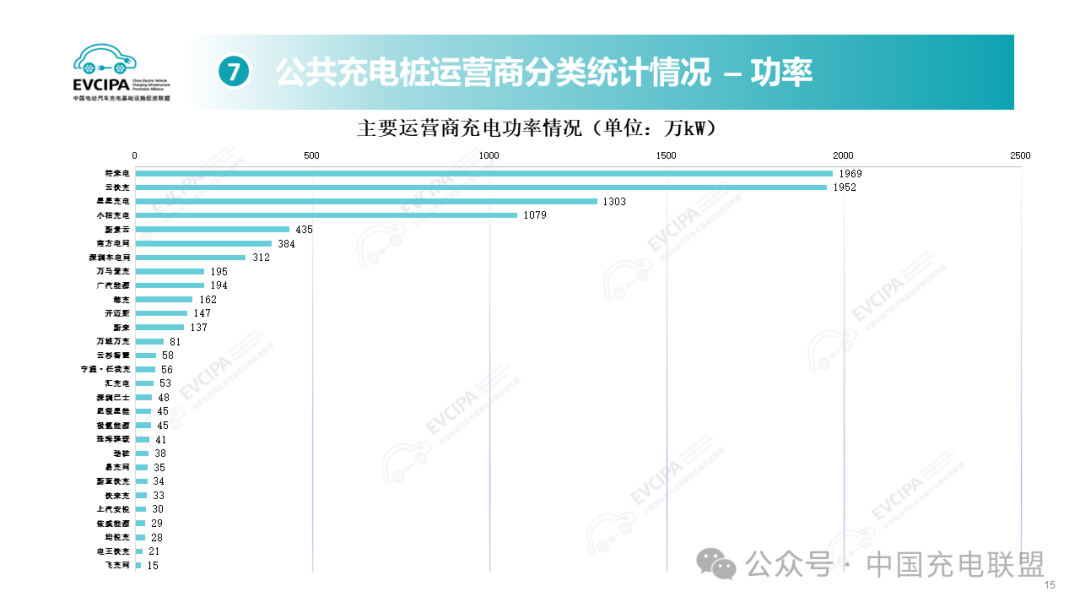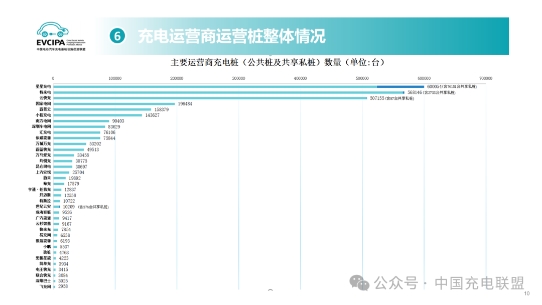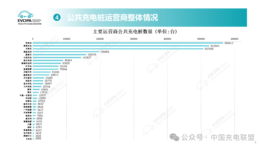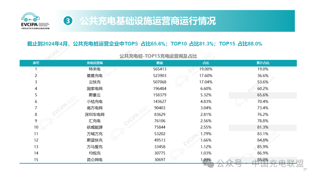 公共充电基础设施运营商运行情况,截止到2024年4月,全国充电运营企业所运营充电桩数量TOP15,分别为:特来电运营56.5万台、星星充电运营52.4万台、云快充运营50.7万台、国家电网运营19.6万台、蔚景云运营15.8万台、小桔充电运营14.4万台、南方电网运营9.0万台、深圳车电网运营8.4万台、汇充电运营7.6万台、依威能源运营7.6万台、万城万充运营5.3万台、蔚蓝快充运营5.0万台、万马爱充运营3.3万台、均悦充3.1万台、昆仑网电运营3.1万台。这15家运营商占总量的88.0%,其余的运营商占总量的12.0%。