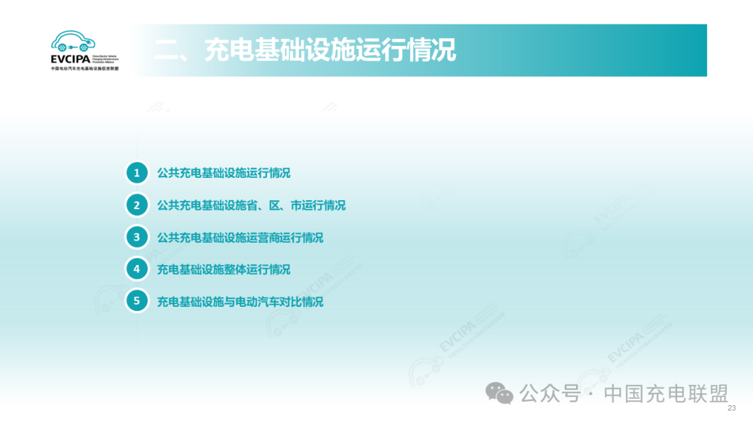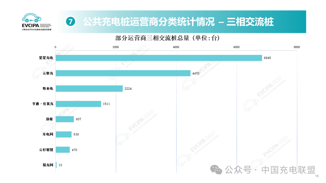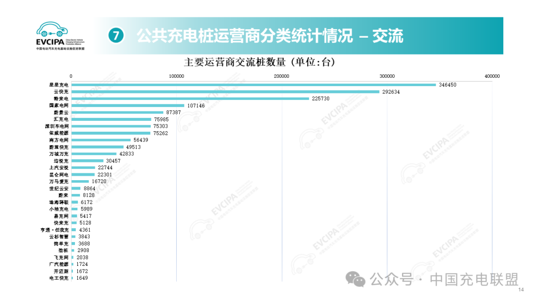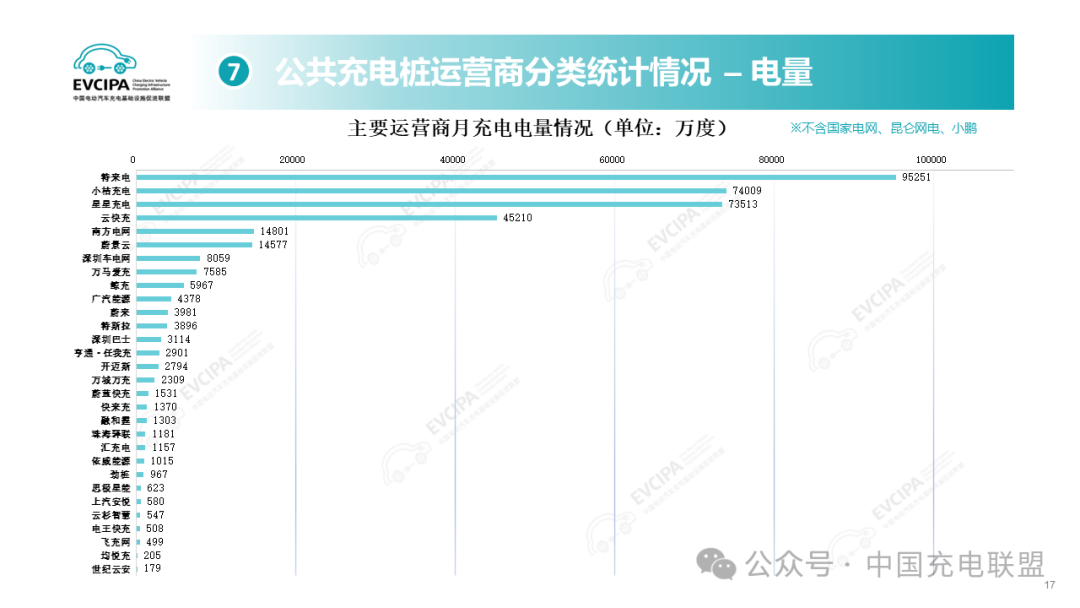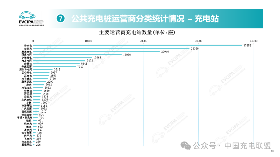 公共充电基础设施运营商运行情况,截止到2024年4月,全国充电运营企业所运营充电桩数量TOP15,分别为:特来电运营56.5万台、星星充电运营52.4万台、云快充运营50.7万台、国家电网运营19.6万台、蔚景云运营15.8万台、小桔充电运营14.4万台、南方电网运营9.0万台、深圳车电网运营8.4万台、汇充电运营7.6万台、依威能源运营7.6万台、万城万充运营5.3万台、蔚蓝快充运营5.0万台、万马爱充运营3.3万台、均悦充3.1万台、昆仑网电运营3.1万台。这15家运营商占总量的88.0%,其余的运营商占总量的12.0%。